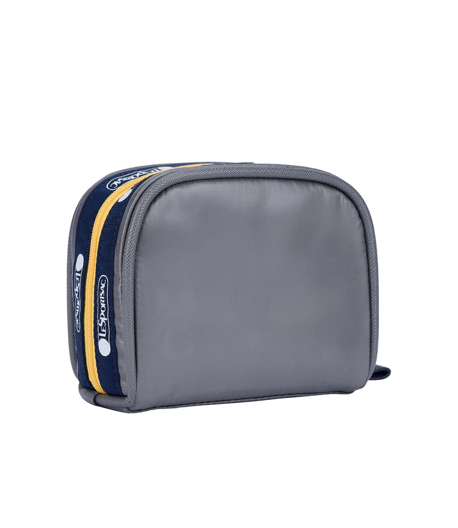 Zipped main closure, Inside gusset for easy opening, Metal hardware, Vegan-leather trim details, Piped edges for added structure