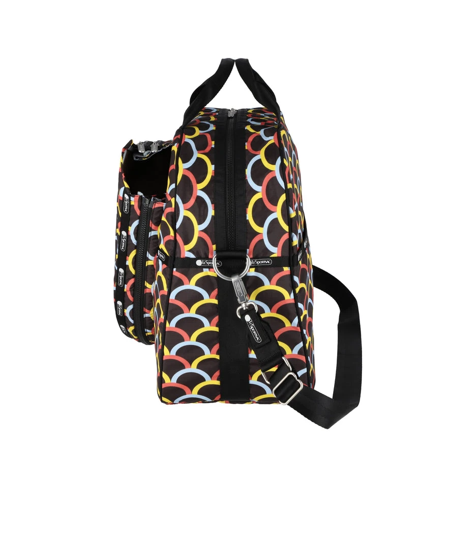 Zipped main closure with dual zipper pulls, Exterior front expandable zip tennis racquet pocket, Exterior back open pocket, Interior front wall with mesh open pocket, Two interior back wall mesh open pockets, Interior side walls with mesh pockets for tennis balls or water bottle, 1.5in/3.8cm wide pinched top handles (Drop: 4 in/10cm, Length: 13.98 in/ 35.5cm, 1.5in/3.8cm wide adjustable/detachable shoulder strap with logo grosgrain details (Max length: 42.12 in/107 cm, Min length: 24.6 in/62.5 cm)