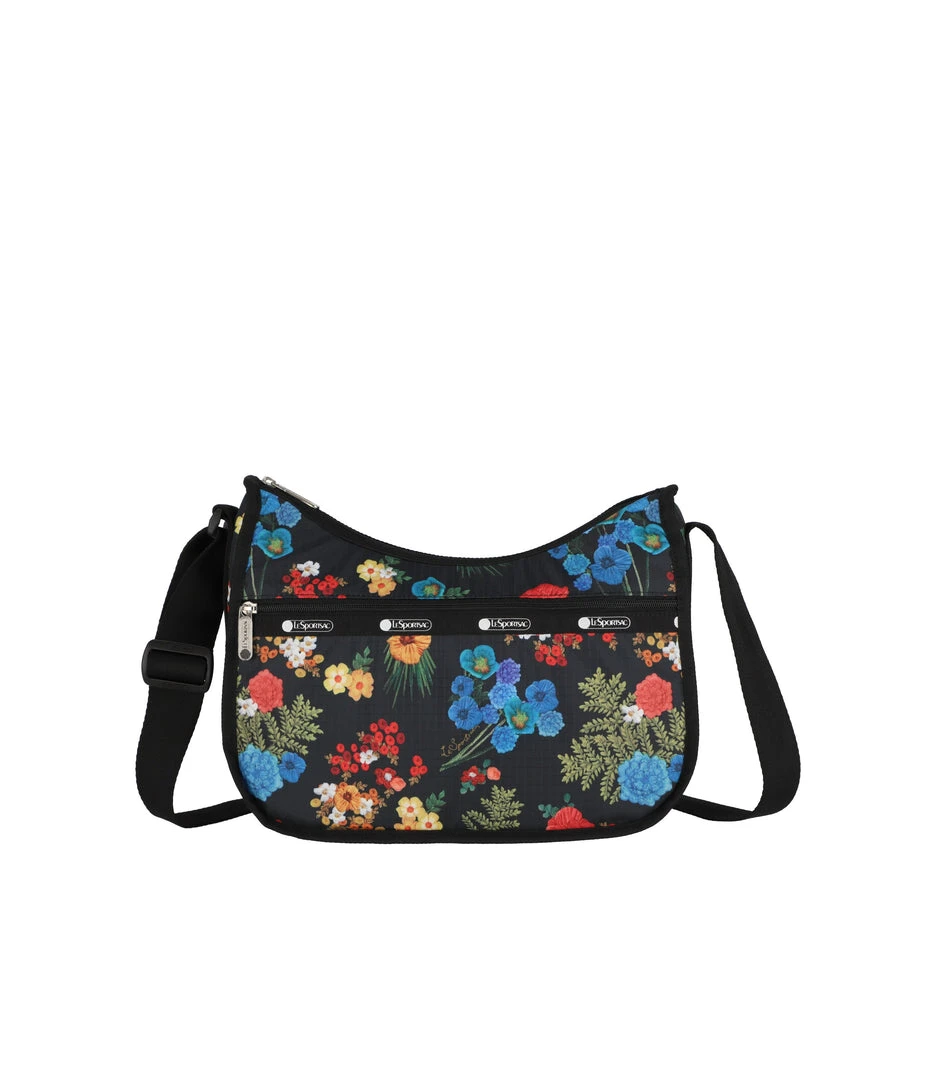 Zipped main closure, Exterior front pocket with zipped closure, Exterior back pocket with zipped closure, Interior back wall hanging zipper pocket, Adjustable shoulder strap (Max. 50in / 127cm), Includes matching pouch with zipped closure