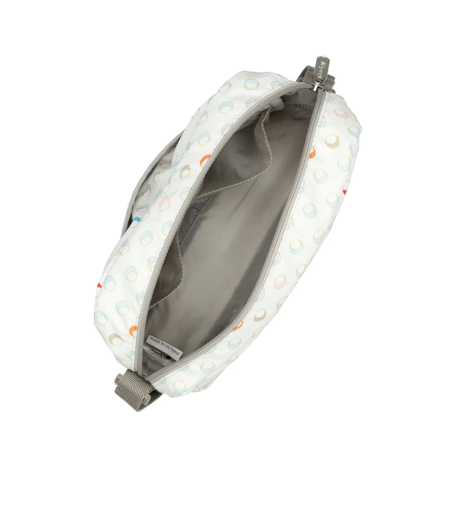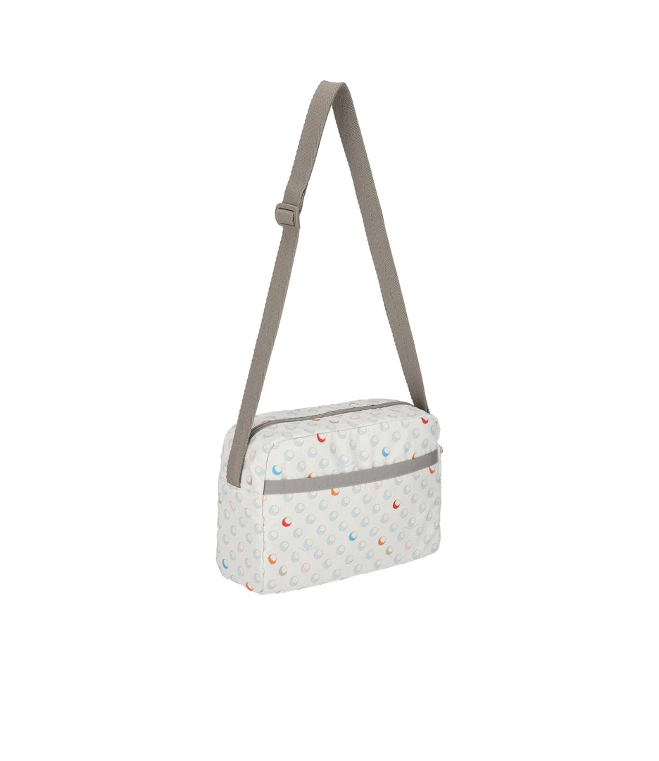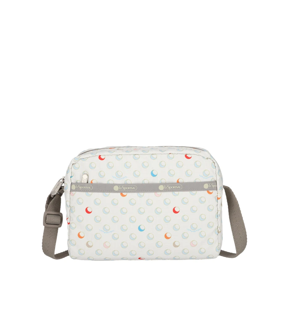 Zip top main closure, Exterior front pocket with zip closure, Exterior back pocket with zip closure, Adjustable crossbody strap (52in/132.08cm), Two interior back wall open pockets, Plastic hardware