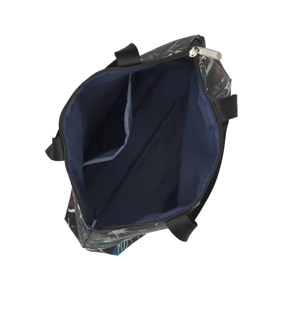 Zipped main closure, 1in (2.5cm) wide top handles (Length: 24.6 in/62.5 cm), Interior back wall combination zip/open pocket