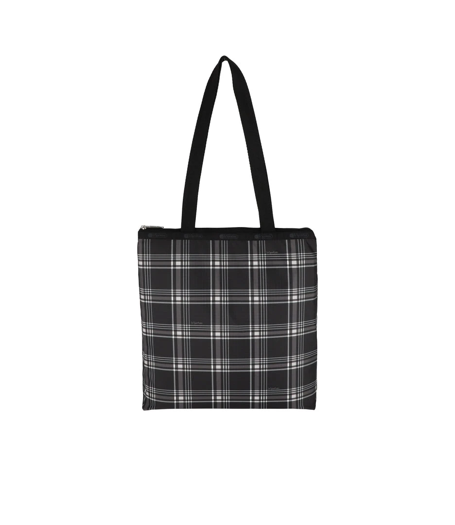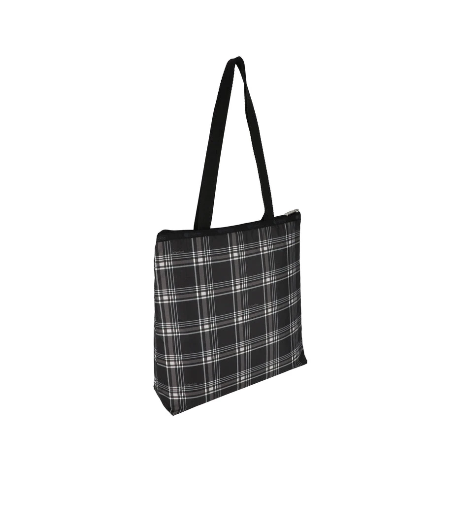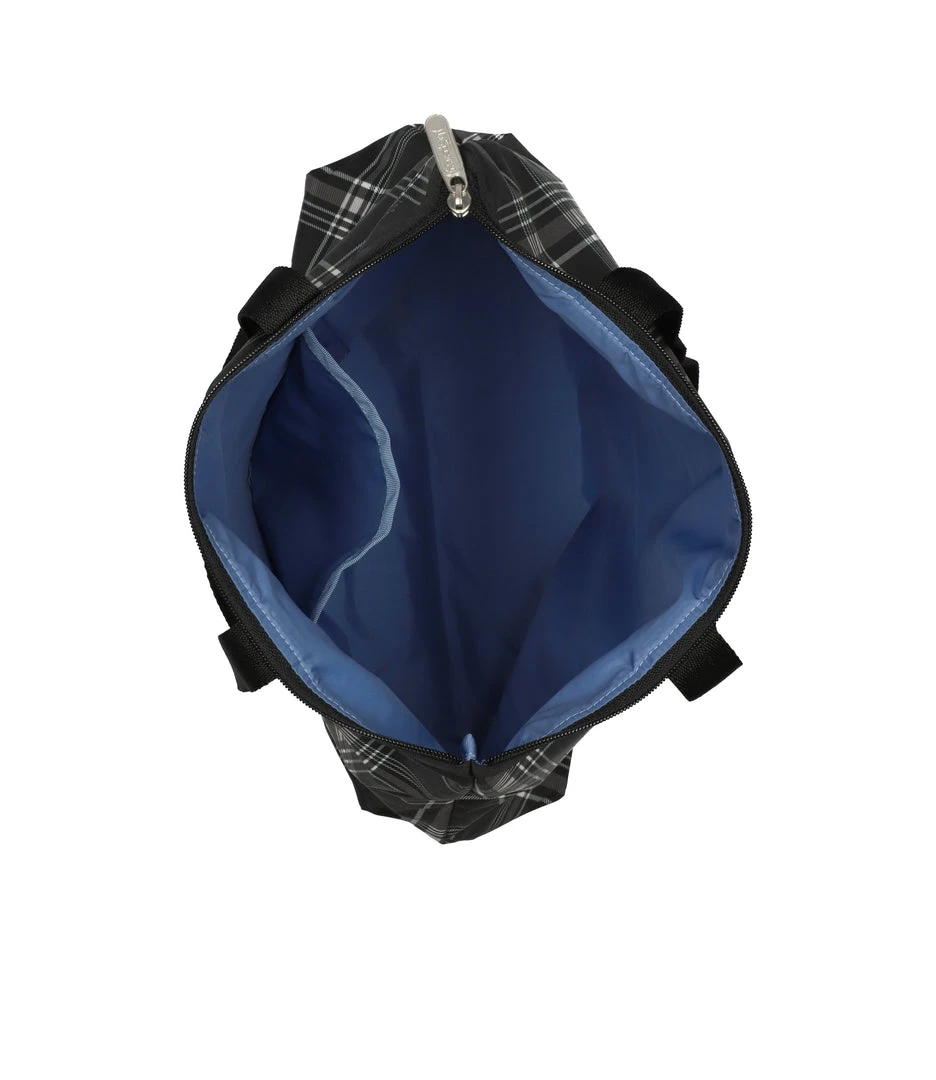 Zipped main closure, 1in (2.5cm) wide top handles (Length: 24.6 in/62.5 cm), Interior back wall combination zip/open pocket