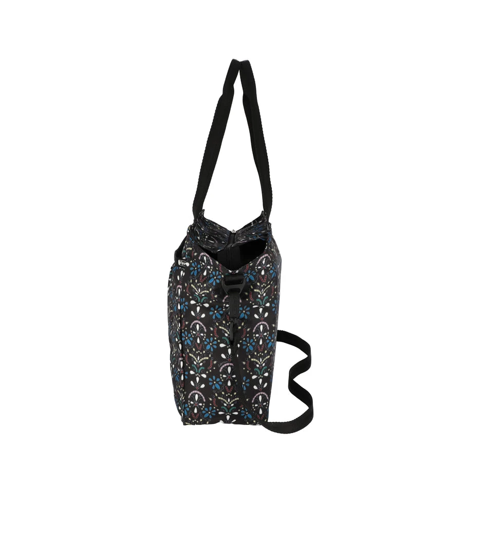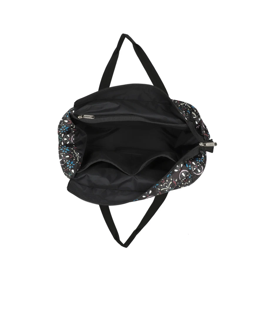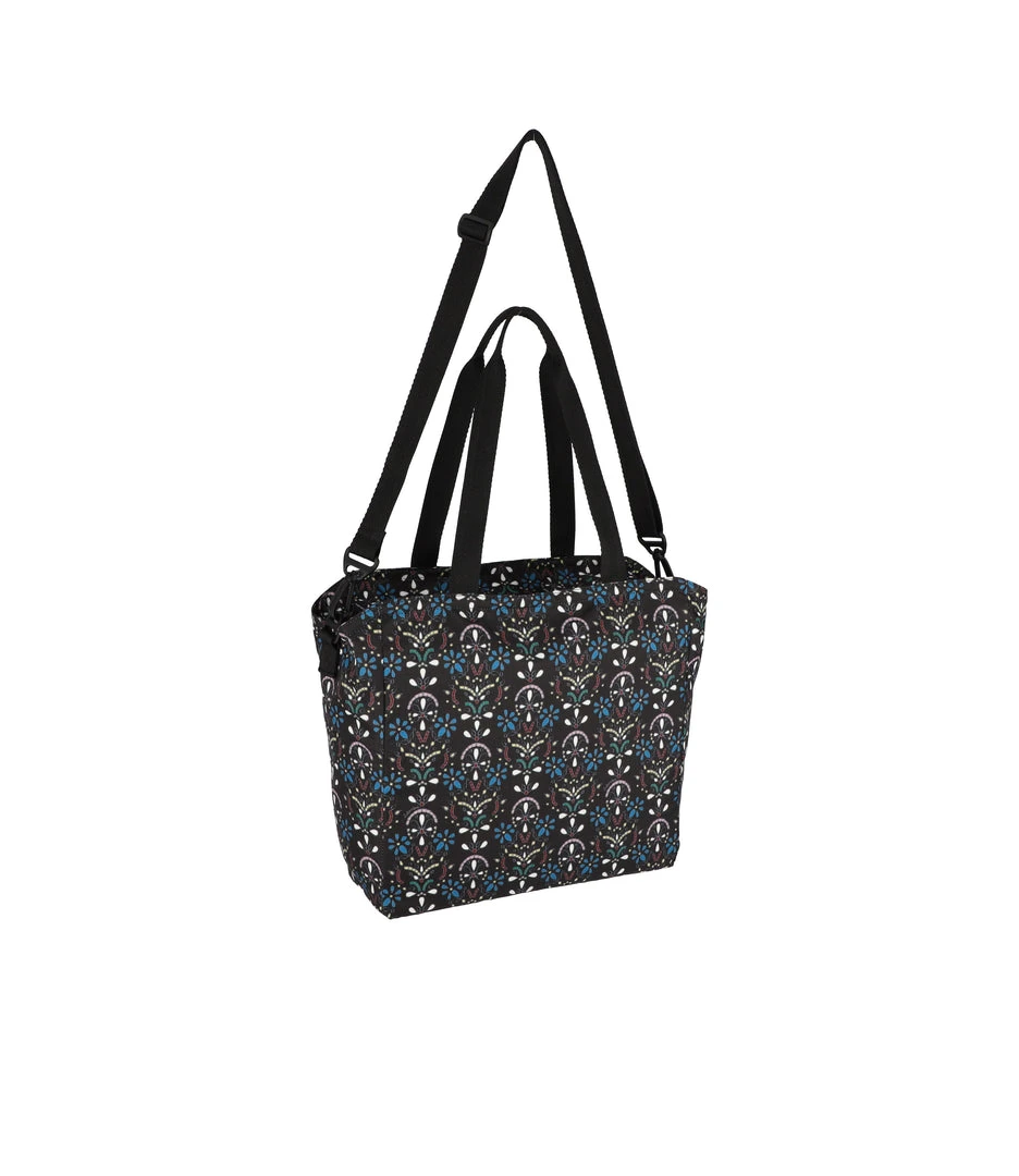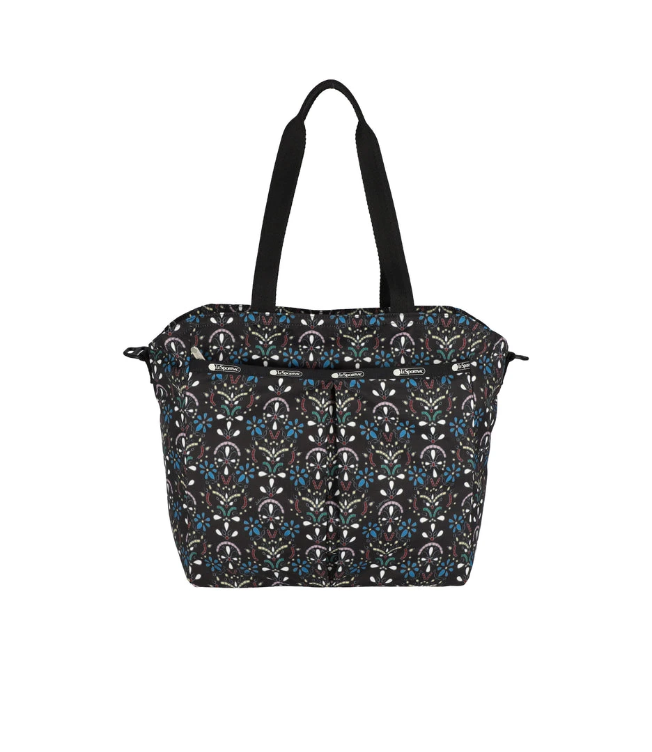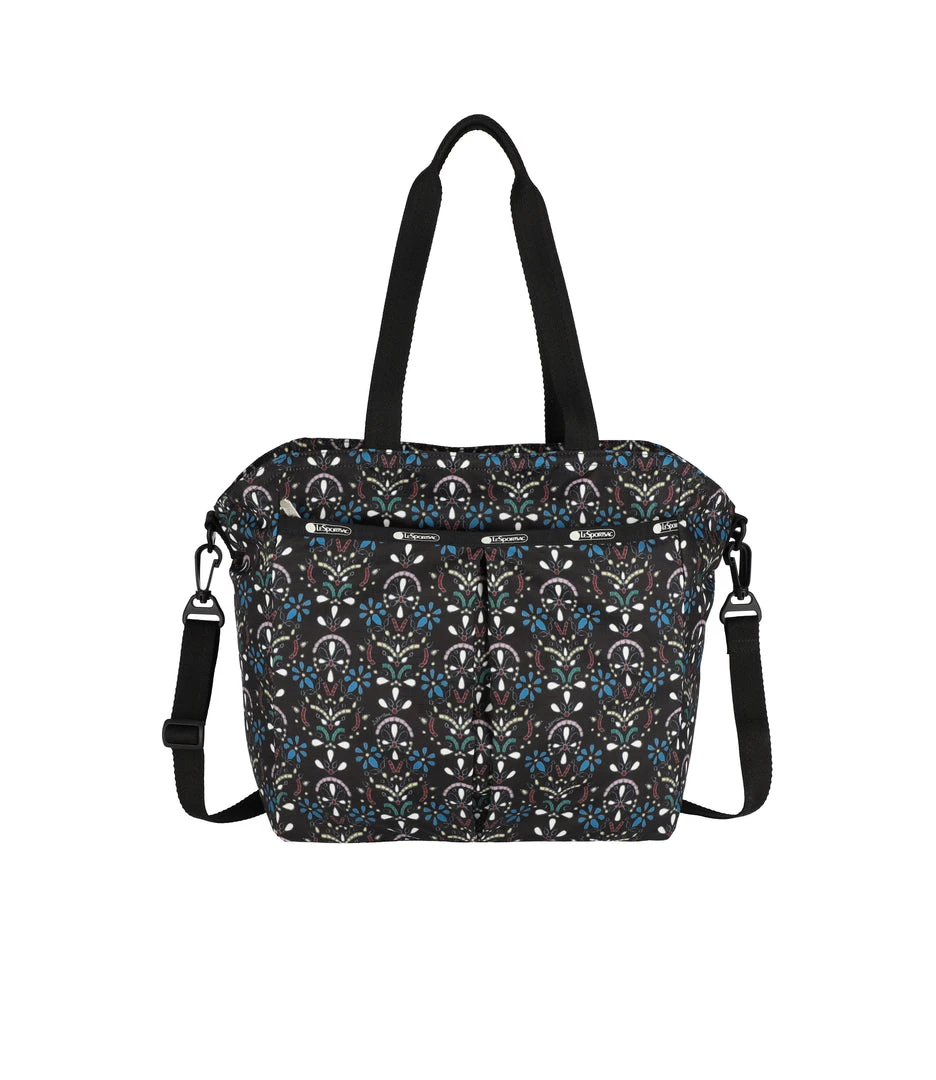 Zip top main closure, Exterior front zip closure pocket with a pleated front, Interior back wall zip closure pocket, Two interior front wall open pockets, 1in/2.5cm wide top handles (Drop: 9.5 in/24.1 cm, Length: 21 in/53.3cm), 1 in/2.5cm wide adjustable/detachable crossbody strap (Max length: 50 in/127cm, Min length: 26.4 in/67cm), Includes matching pouch with zip closure (6.1H x 7.9W in/15.5H x 20D cm)