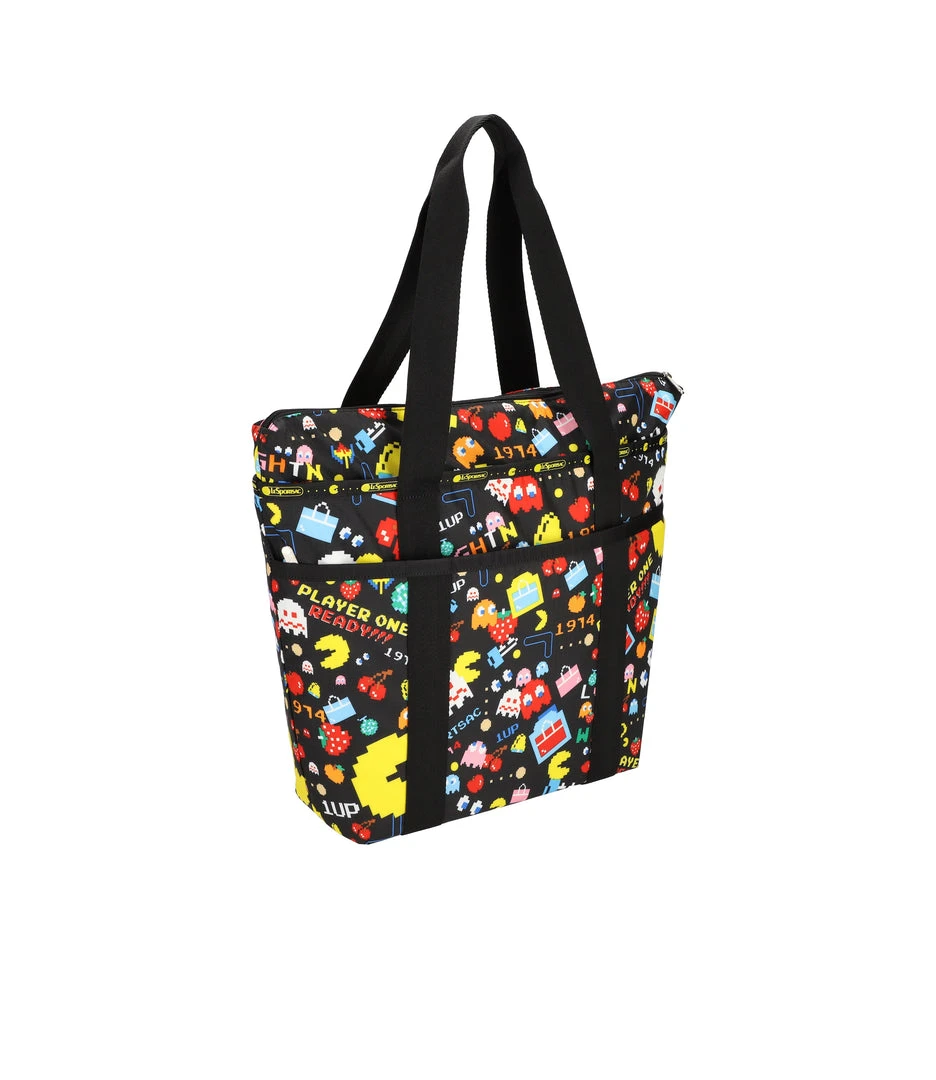 Zip main closure, Top zipper gusset can be expanded upward for extra interior room (which adds 2in/5.1cm of vertical space), Exterior front small open pocket for phone, Exterior back full-length zip pocket, Two interior front wall open pockets, Interior back wall zip pocket, 1.5in/3.8cm wide pinched top handles (Drop: 11in/27.94cm, Length: 26.37in/67 cm)