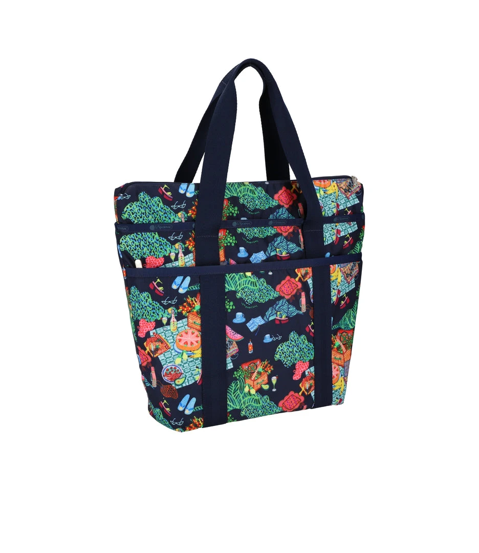 Zip main closure, Top zipper gusset can be expanded upward for extra interior room (which adds 2in/5.1cm of vertical space), Exterior front small open pocket for phone, Exterior back full-length zip pocket, Two interior front wall open pockets, Interior back wall zip pocket, 1.5in/3.8cm wide pinched top handles (Drop: 11in/27.94cm, Length: 26.37in/67 cm)