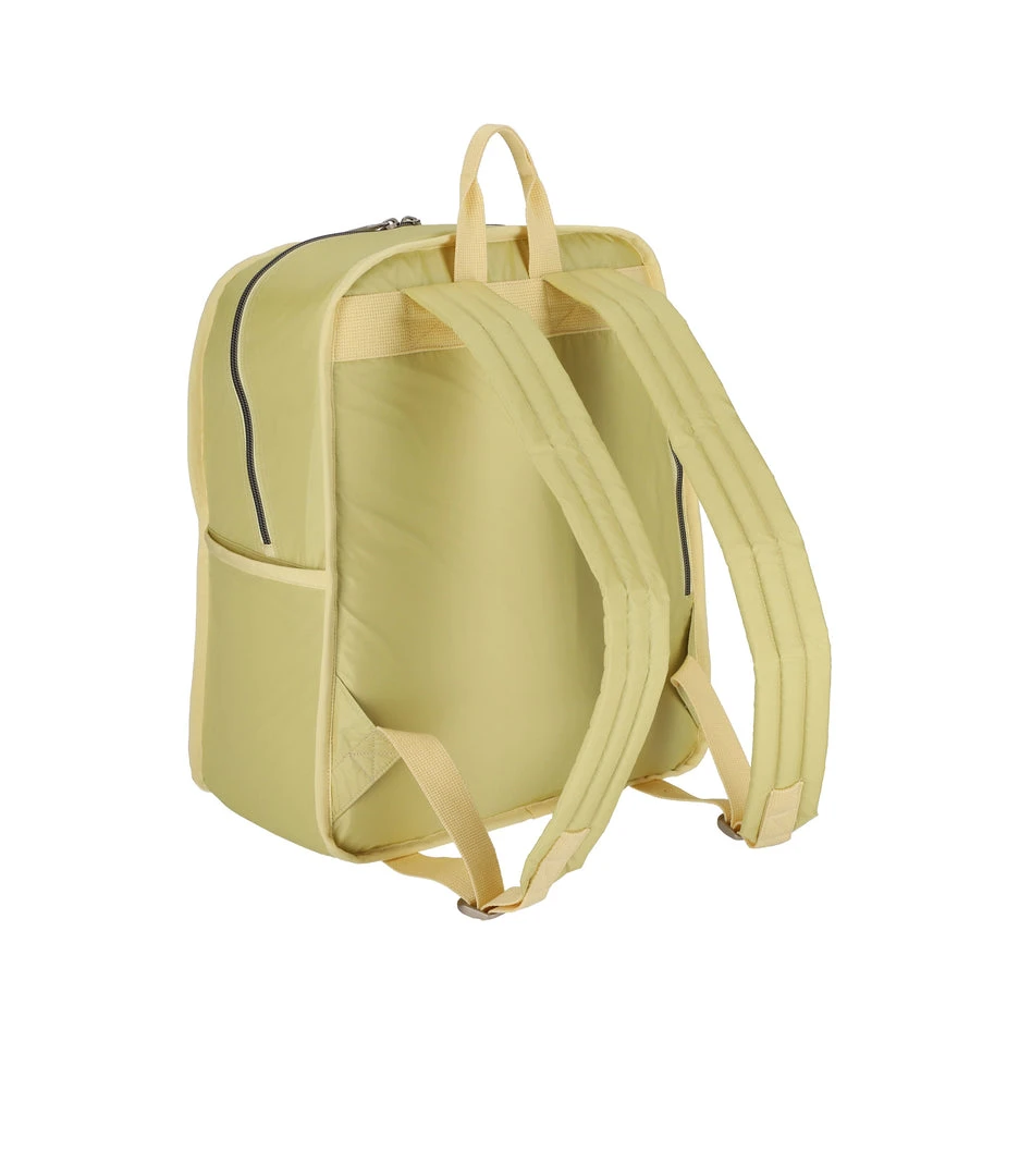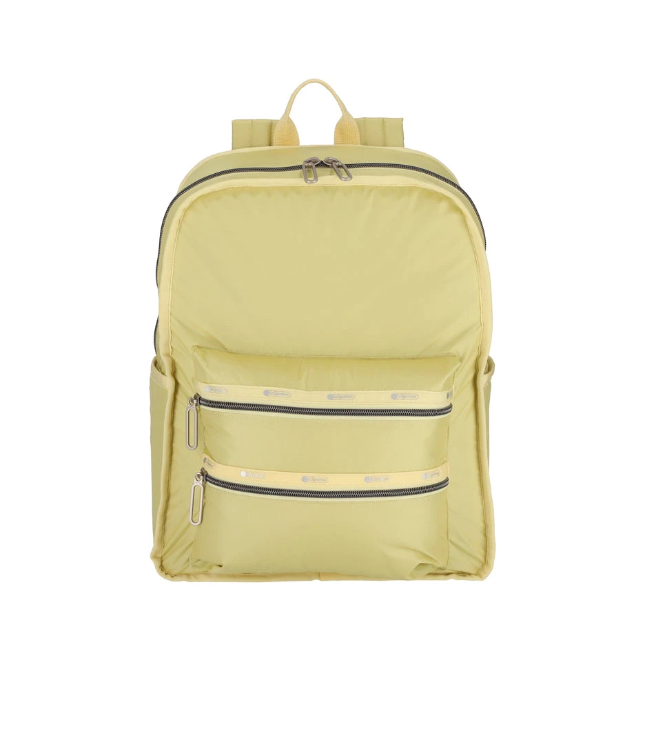 Zip main closure with dual zipper pulls, Adjustable padded shoulder straps, Two exterior front pockets with zip closures, Pinched top loop for hanging, Two exterior side open top pockets for water bottles, Exterior back small zip pocket for phone or wallet, Interior back wall padded laptop pocket with snap closure (fits laptops up to 15in), Interior front wall zip pocket