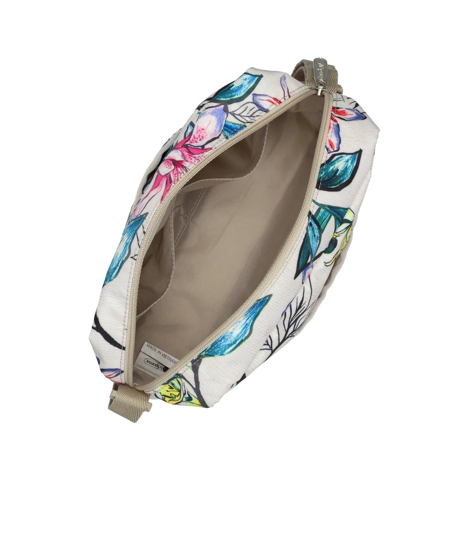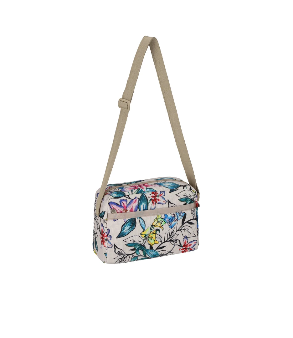 Zip top main closure, Exterior front pocket with zip closure, Exterior back pocket with zip closure, Adjustable crossbody strap (52in/132.08cm), Two interior back wall open pockets, Plastic hardware