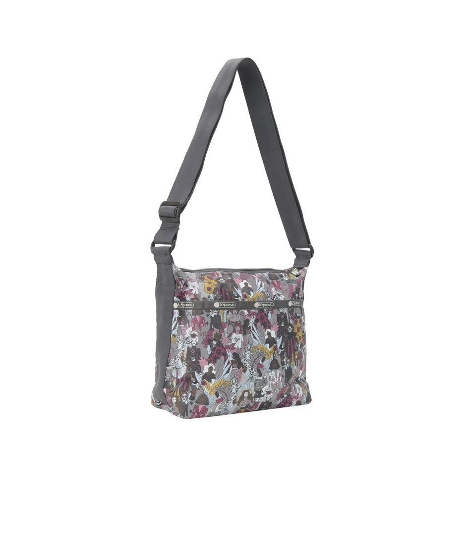 Zip main closure, Exterior front pocket with zip closure, Exterior back open pocket with magnetic snap closure, Two Interior front wall open pockets, Interior back combination zip/open pocket, 1.5 in/3.8cm wide adjustable shoulder strap (Max length: 53 in/134.5 cm, Min length: 30.3 in/ 77 cm)