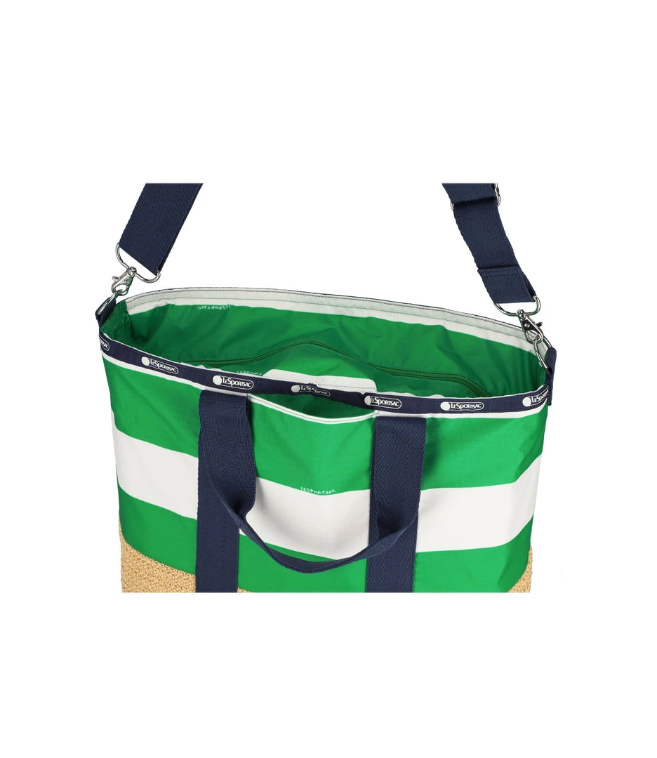 Features straw construction on the lower half of the bag. Please spot clean only, as continuous washing or rough treatment may cause damage.