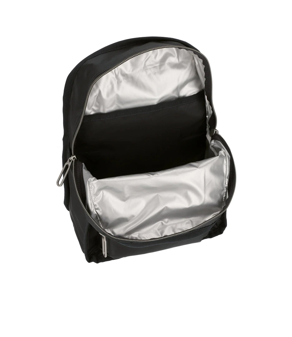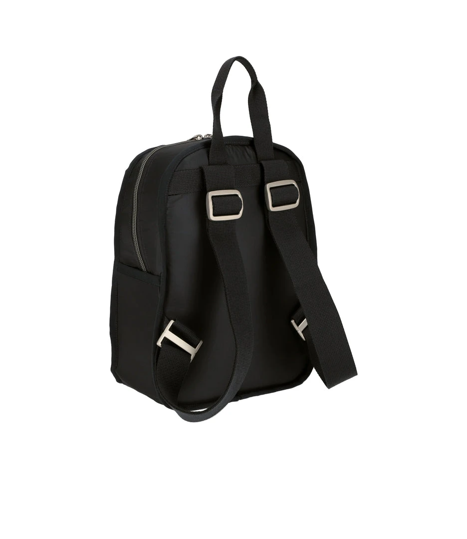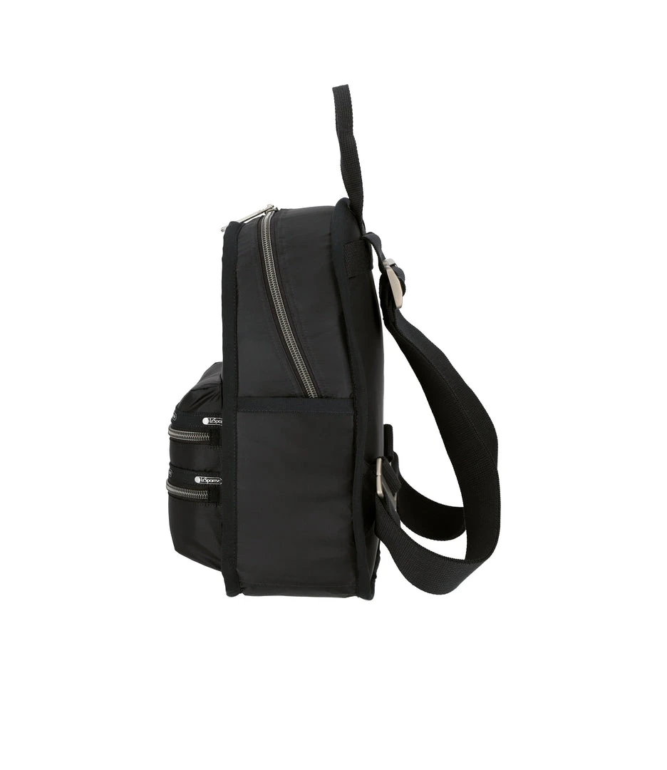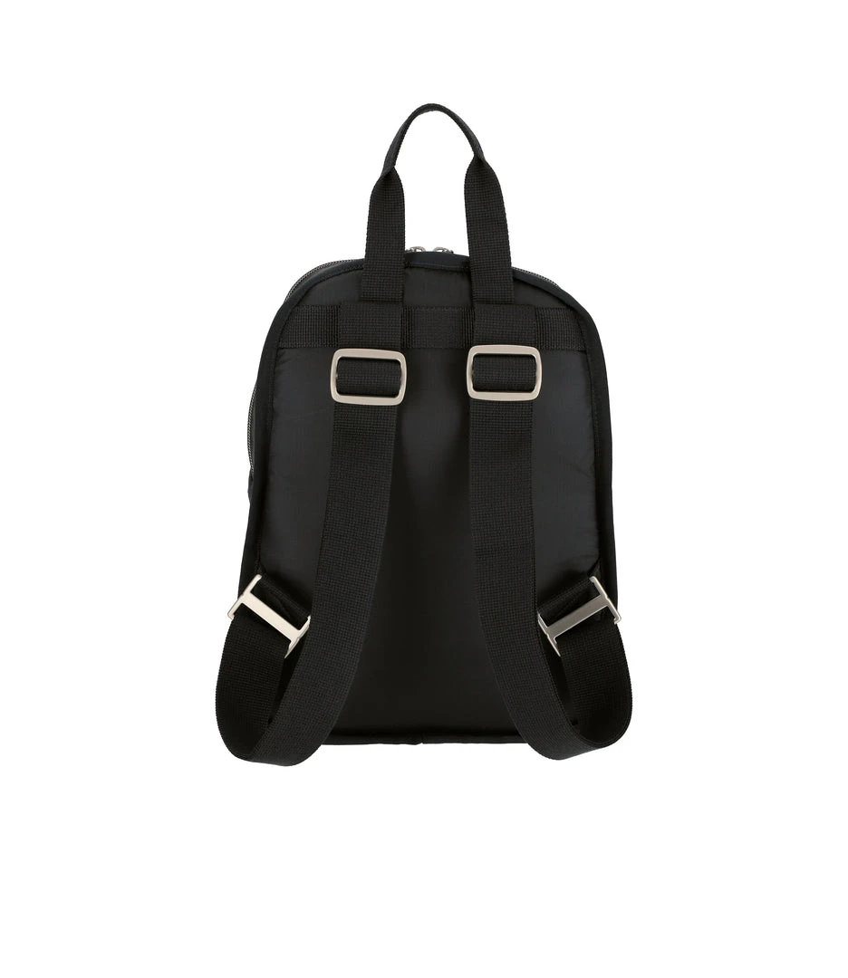 Zip main closure with dual zipper pulls, Two exterior front pockets with zip closures, Adjustable webbing shoulder straps, Pinched top loop handle, Interior back wall open pocket