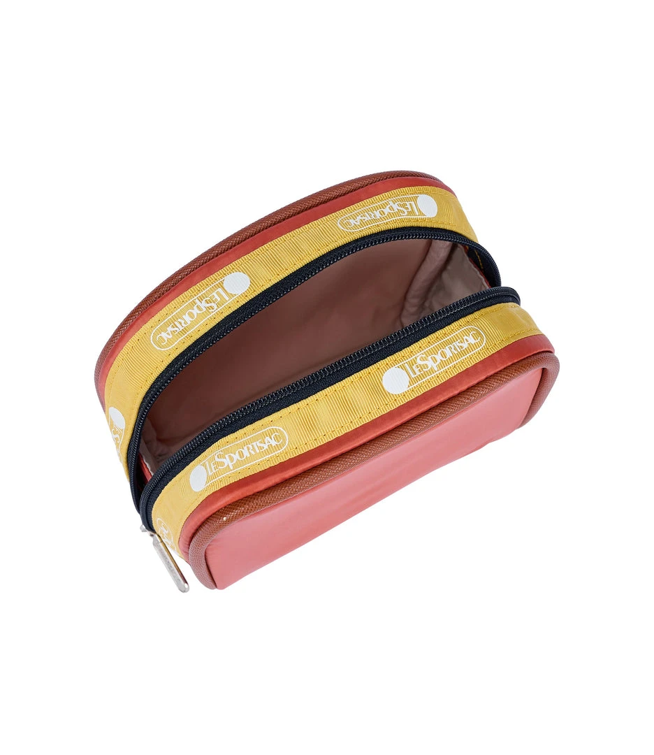 Zipped main closure, Inside gusset for easy opening, Metal hardware, Vegan-leather trim details, Piped edges for added structure