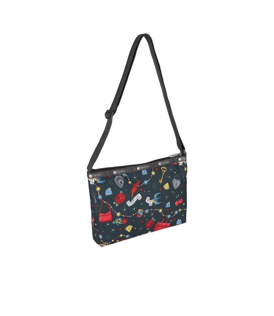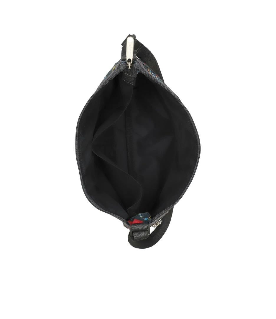 Zip main closure, Two exterior front pockets with zip closures, Adjustable crossbody strap (Max. 50.25in / 127.64cm), Two interior back wall open pockets7.5H x 11W x 2D in, 18.42H x 27.94W x 5.08D cm