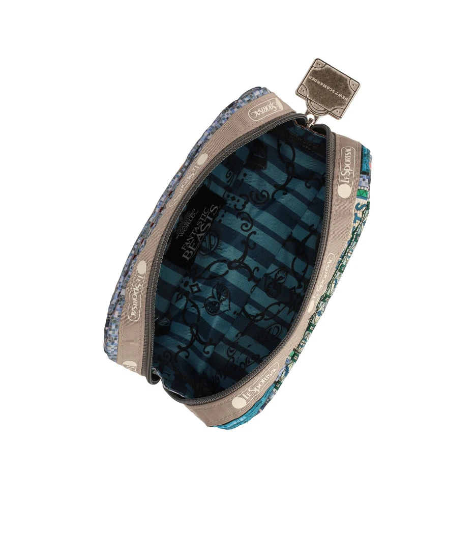 Zipped main closure, Interior back wall open pocket, Two interior front wall open pockets