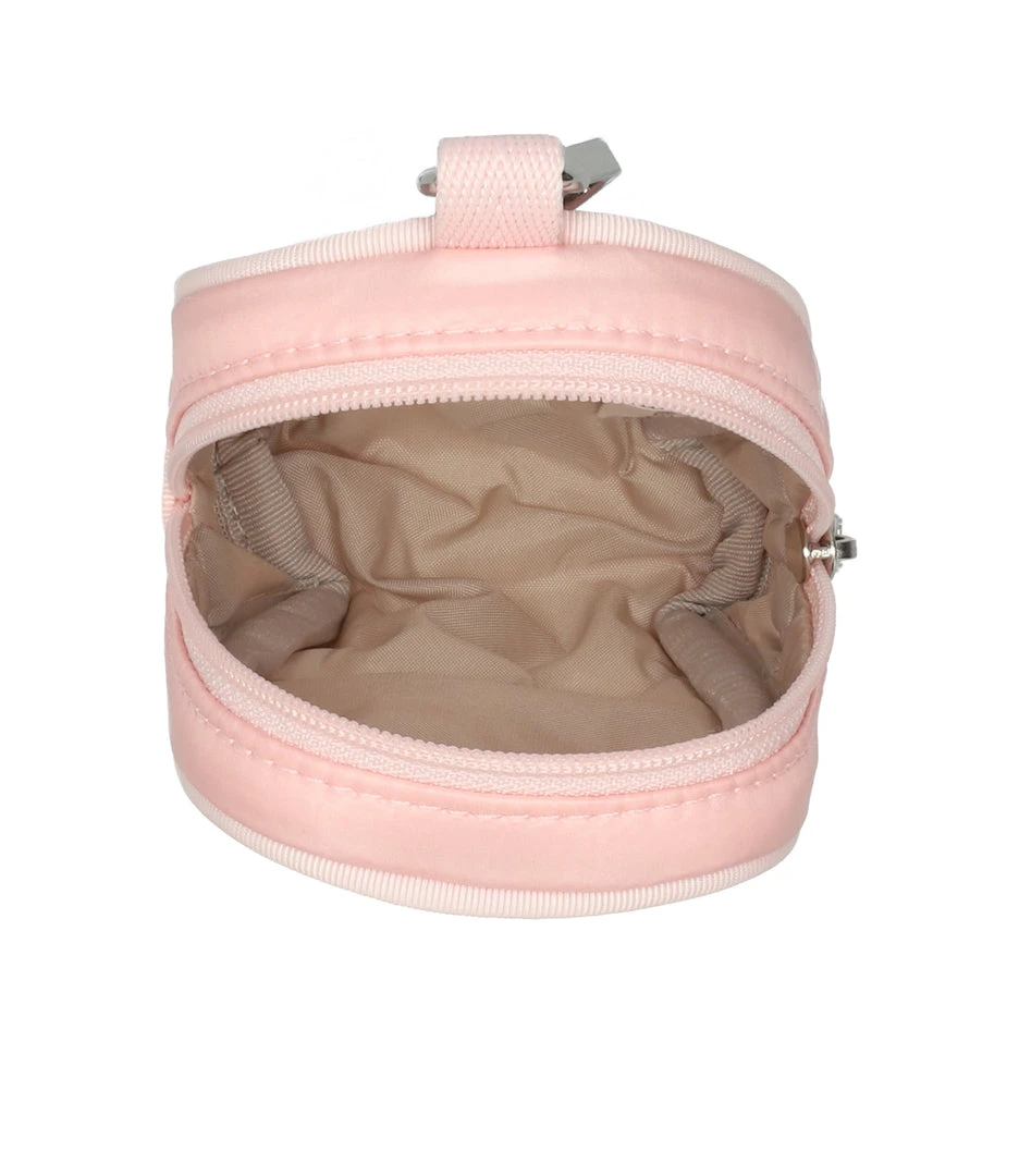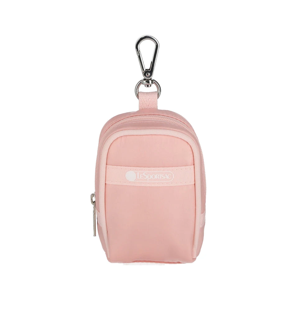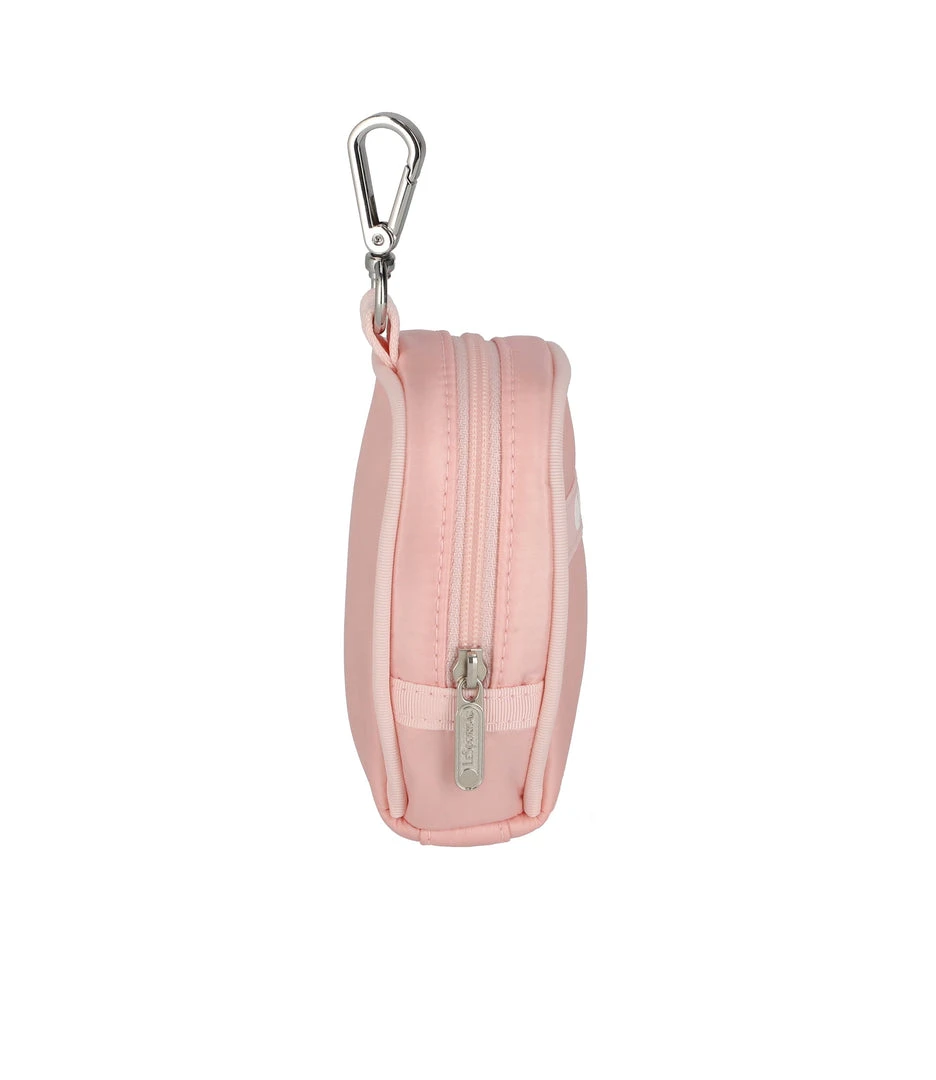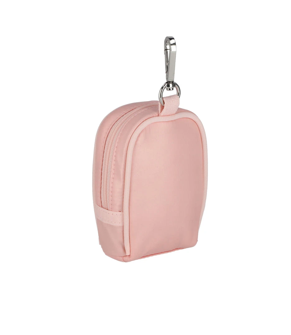 Small zip closure pouch with top metal clip (to attach on your bag or key ring). Fits a variety of small items such as: wireless earbuds, lip balm, travel sized hand sanitizer, and coins.