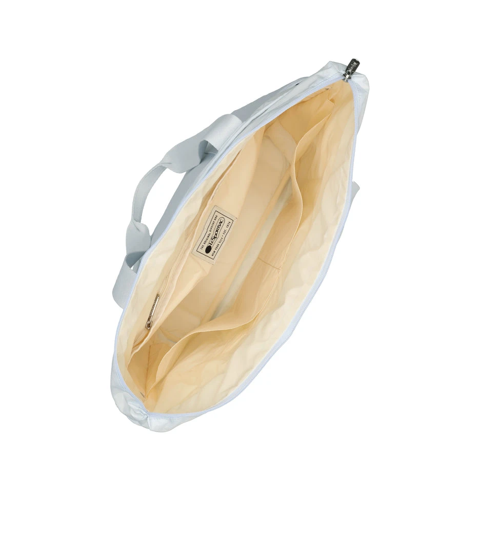 Zip main closure, Top zipper gusset can be expanded upward for extra interior room (which adds 2in/5.1cm of vertical space), Exterior front small open pocket for phone, Exterior back full-length zip pocket, Two interior front wall open pockets, Interior back wall zip pocket, 1.5in/3.8cm wide pinched top handles (Drop: 11in/27.94cm, Length: 26.37in/67 cm)