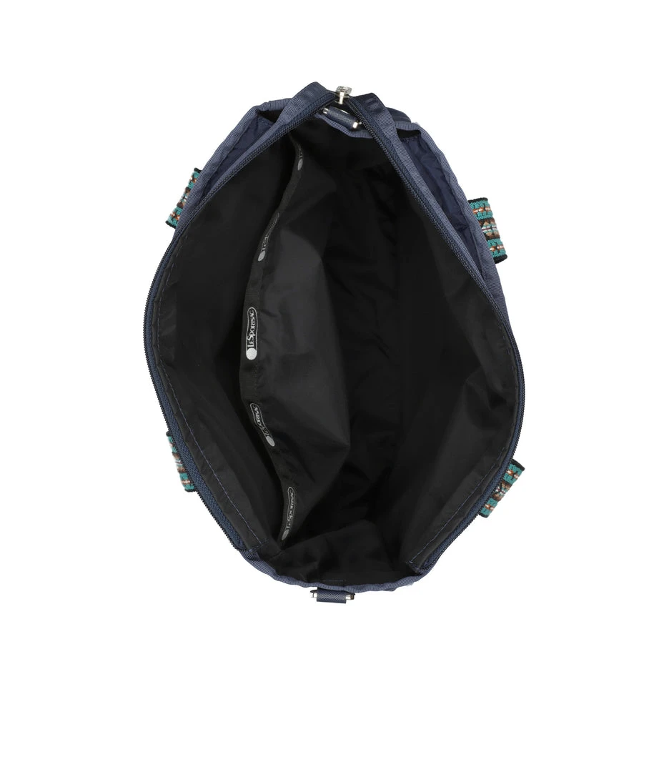 Zipped main closure, Exterior back panel zip pocket, Interior back wall open pocket,1.5in/3.8cm wide pinched top handles (Drop:11 in/ 28 cm, Length: 26.6in/ 67.5 cm), 1.5in/3.8cm wide adjustable/detachable shoulder strap (Min length: 28.5in/72.5 cm, Max length: 52in/132cm), Vegan-leather trim details, Metal hardware