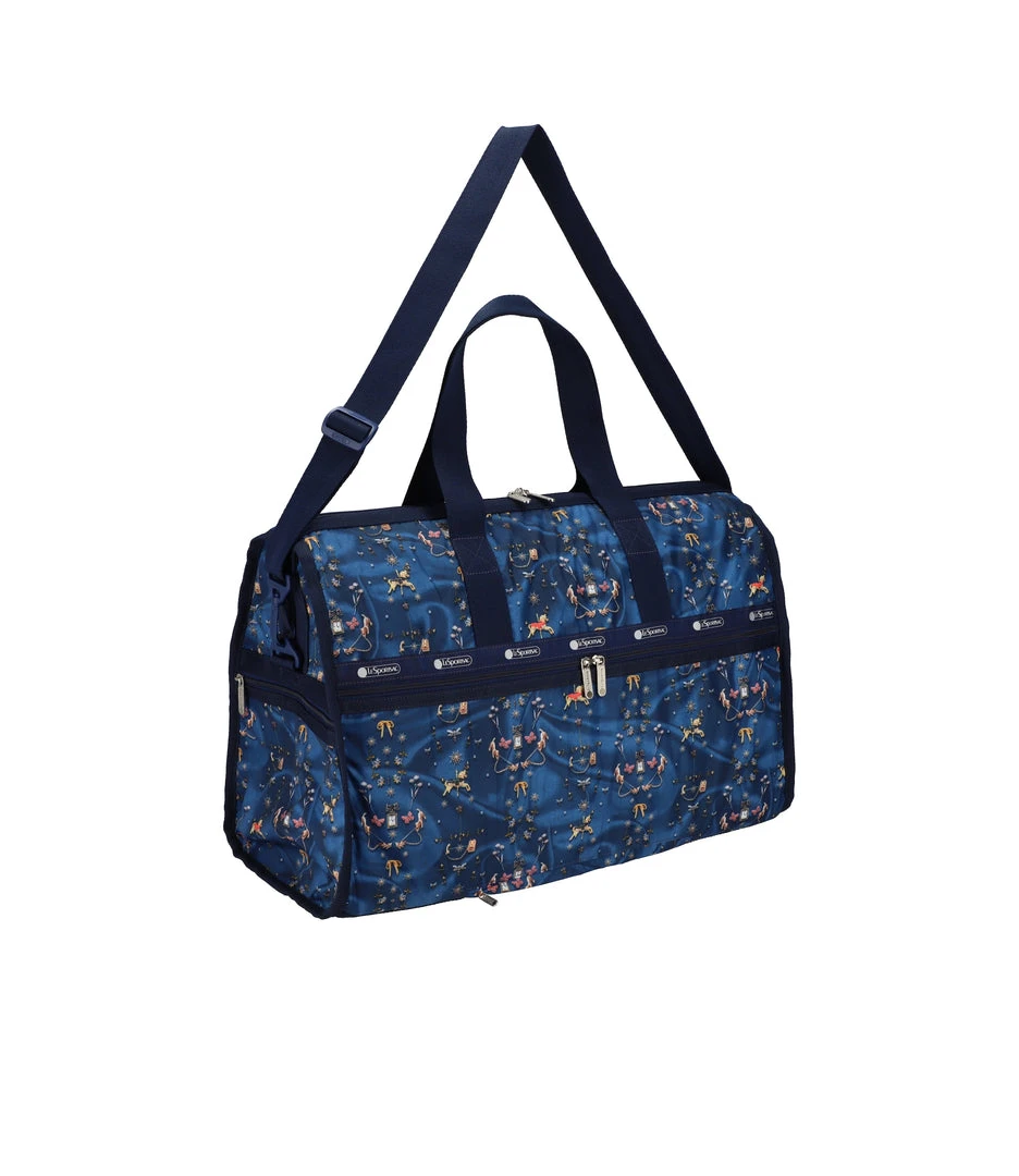 Zip main closure with dual zipper pulls, 8.5in (21.59cm) Top handle drop, 1.5in (3.81cm) Wide adjustable/detachable crossbody strap (Max. 42in/106.68cm), Exterior front panel zipper pocket, Exterior back panel zip closure pocket with dual zipper pulls and a bottom zipper to convert pocket into a sleeve (to slide over rolling luggage handles), Two exterior side pockets with zip closures, Three interior front wall open pockets, Interior back wall combination zip/open pocket